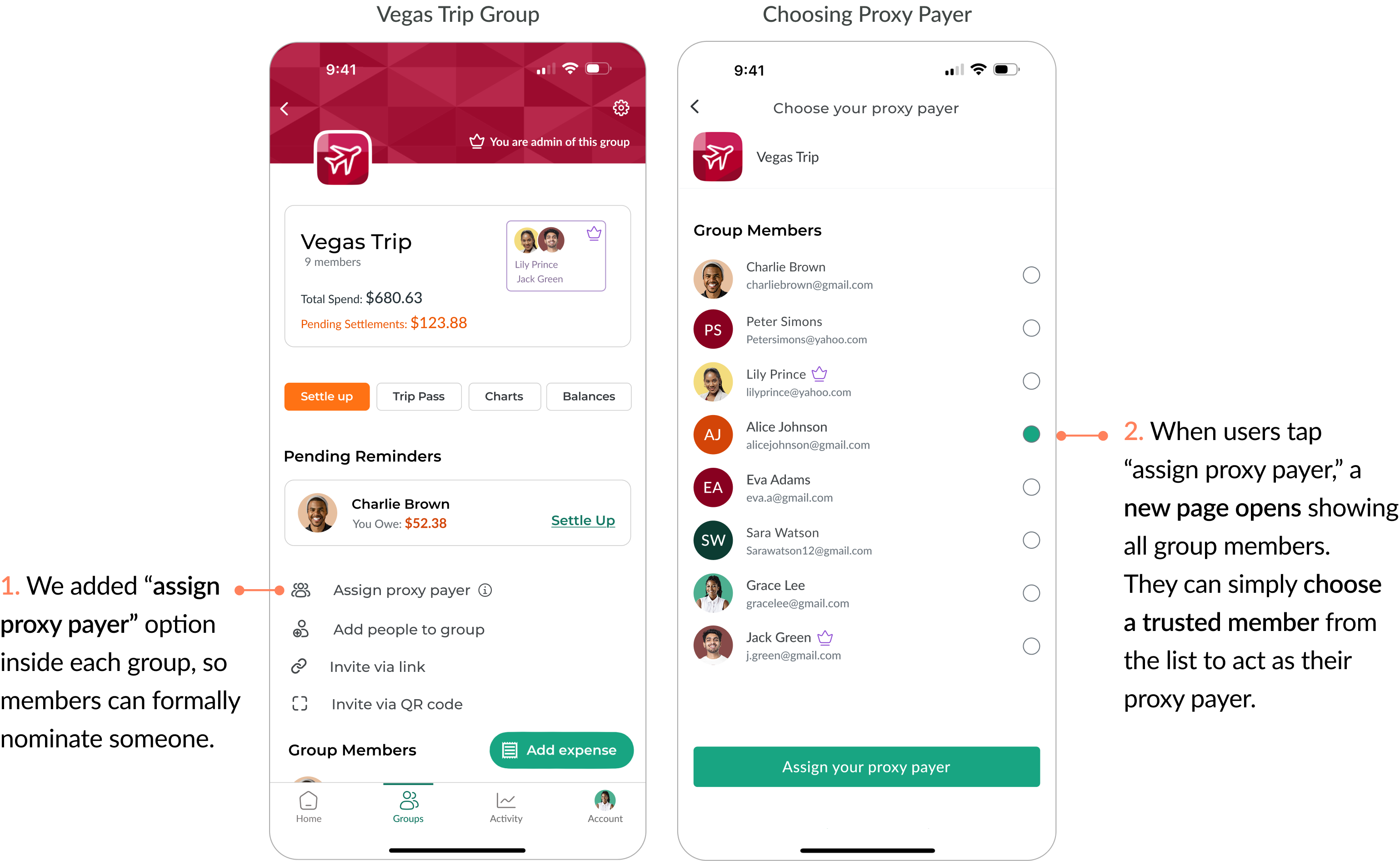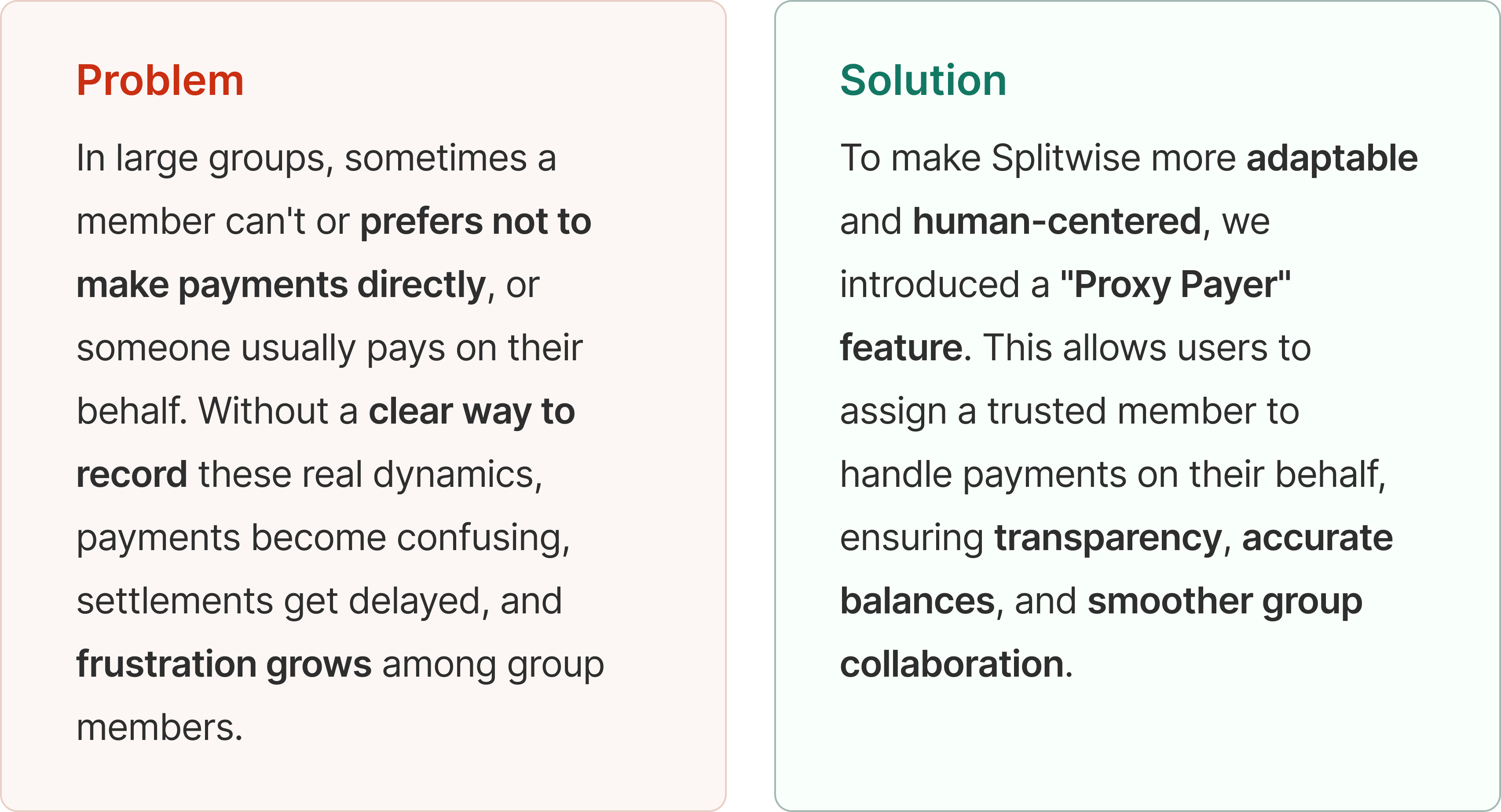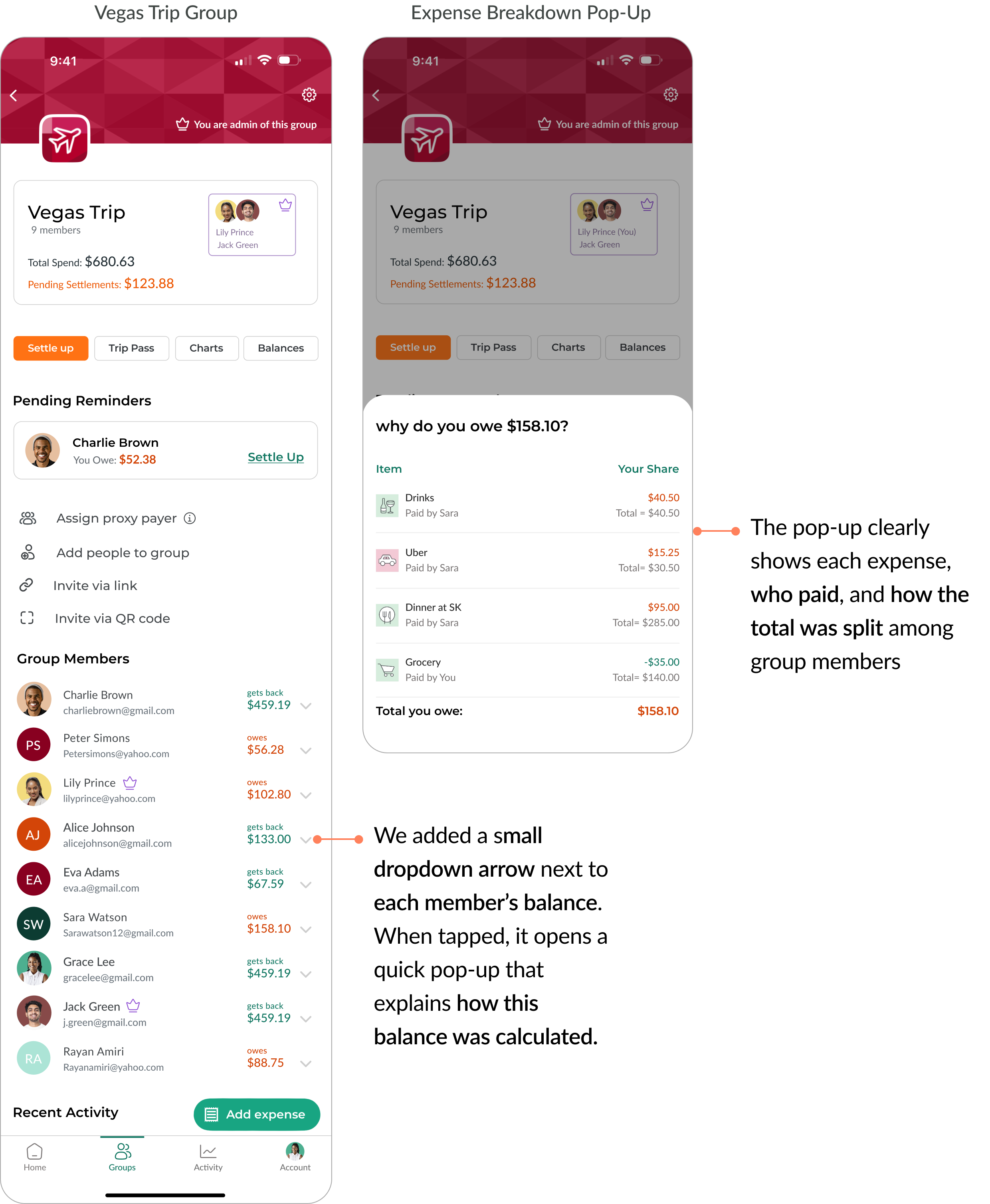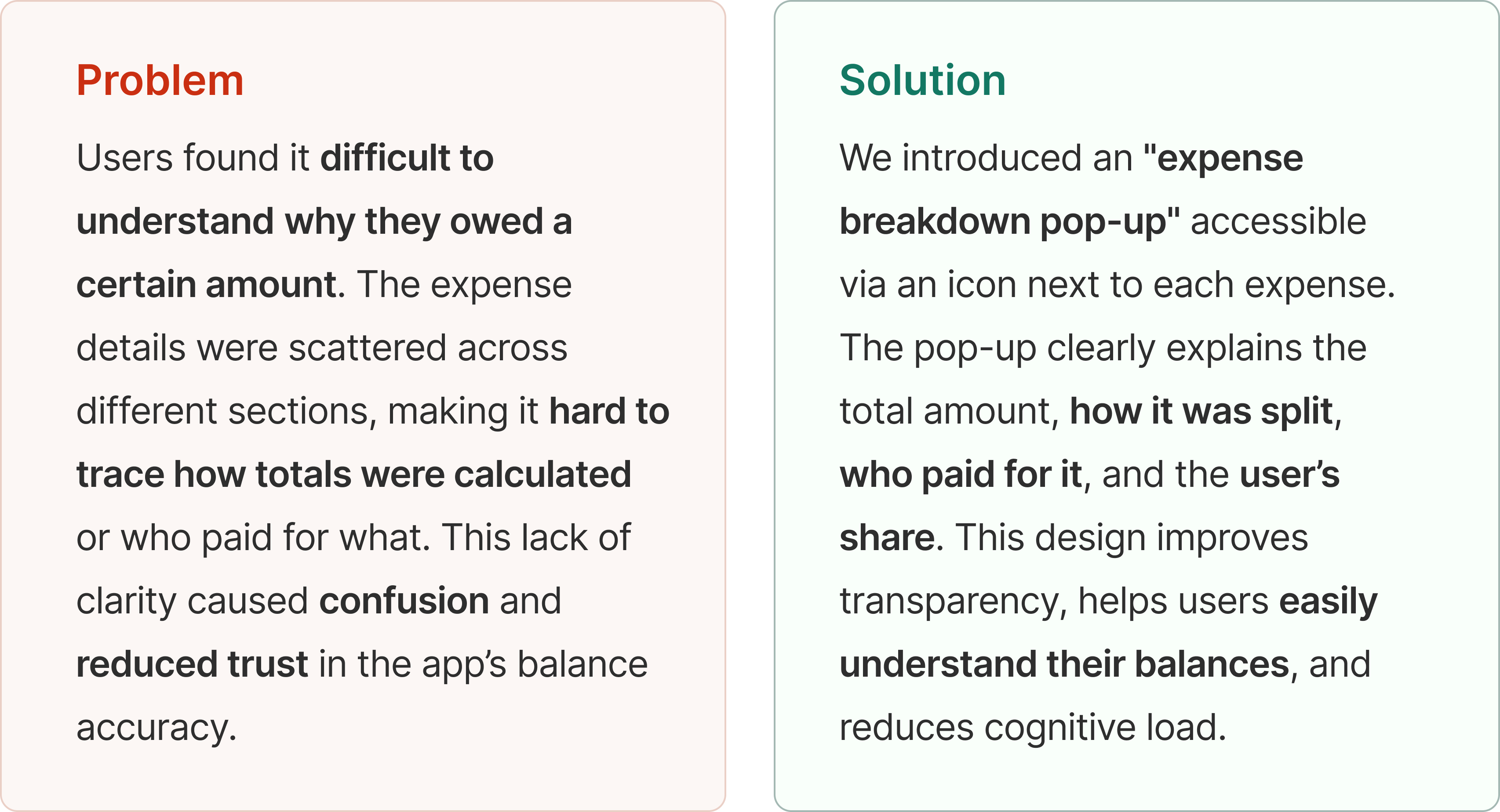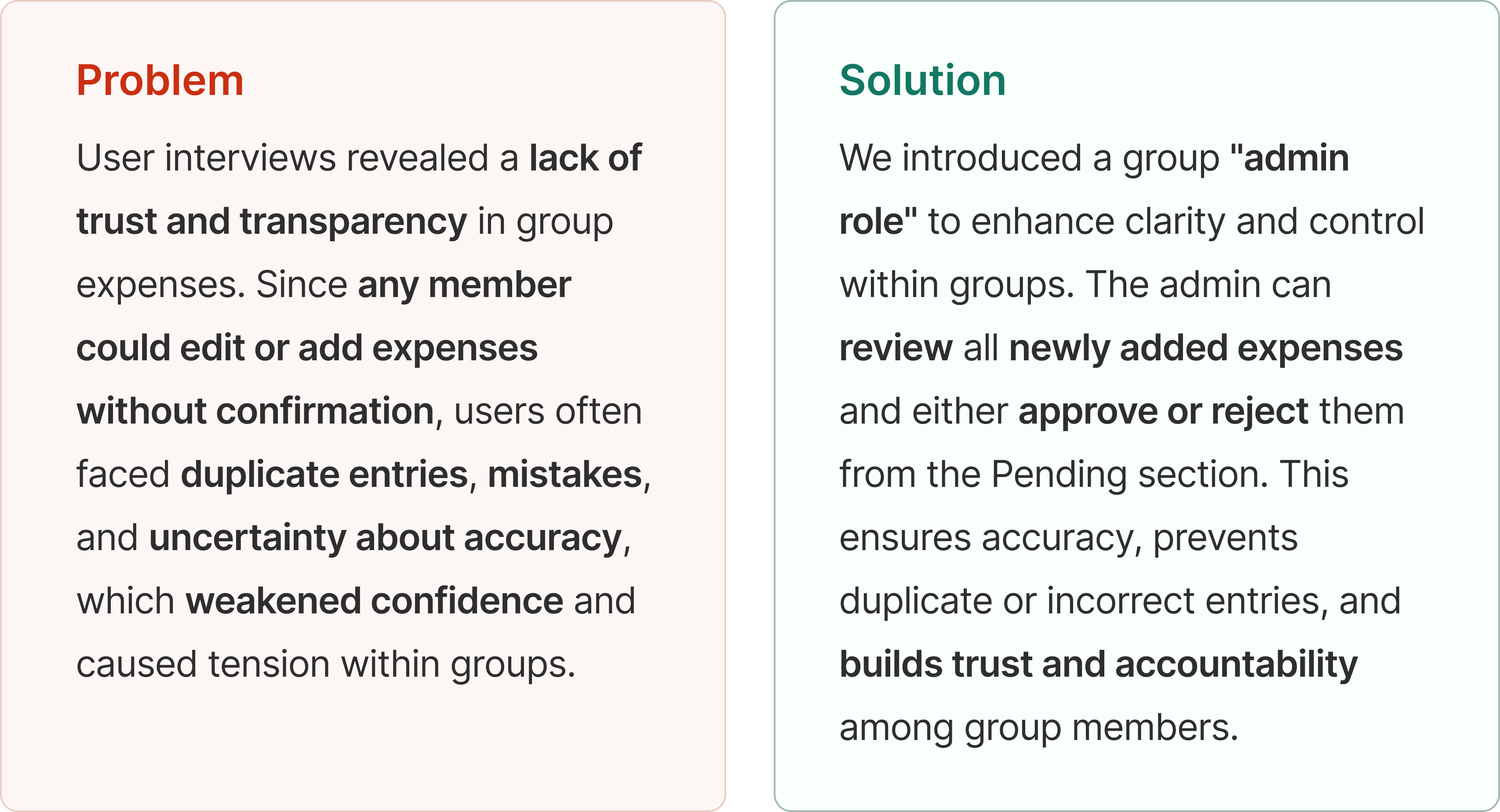 Since we didn’t have real usage data, we focused on what users said and how they felt during testing. Our users’ feedback showed us exactly what mattered most: giving them a clearer sense of who can do what, and making the process of managing group expenses more transparent and stress-free.