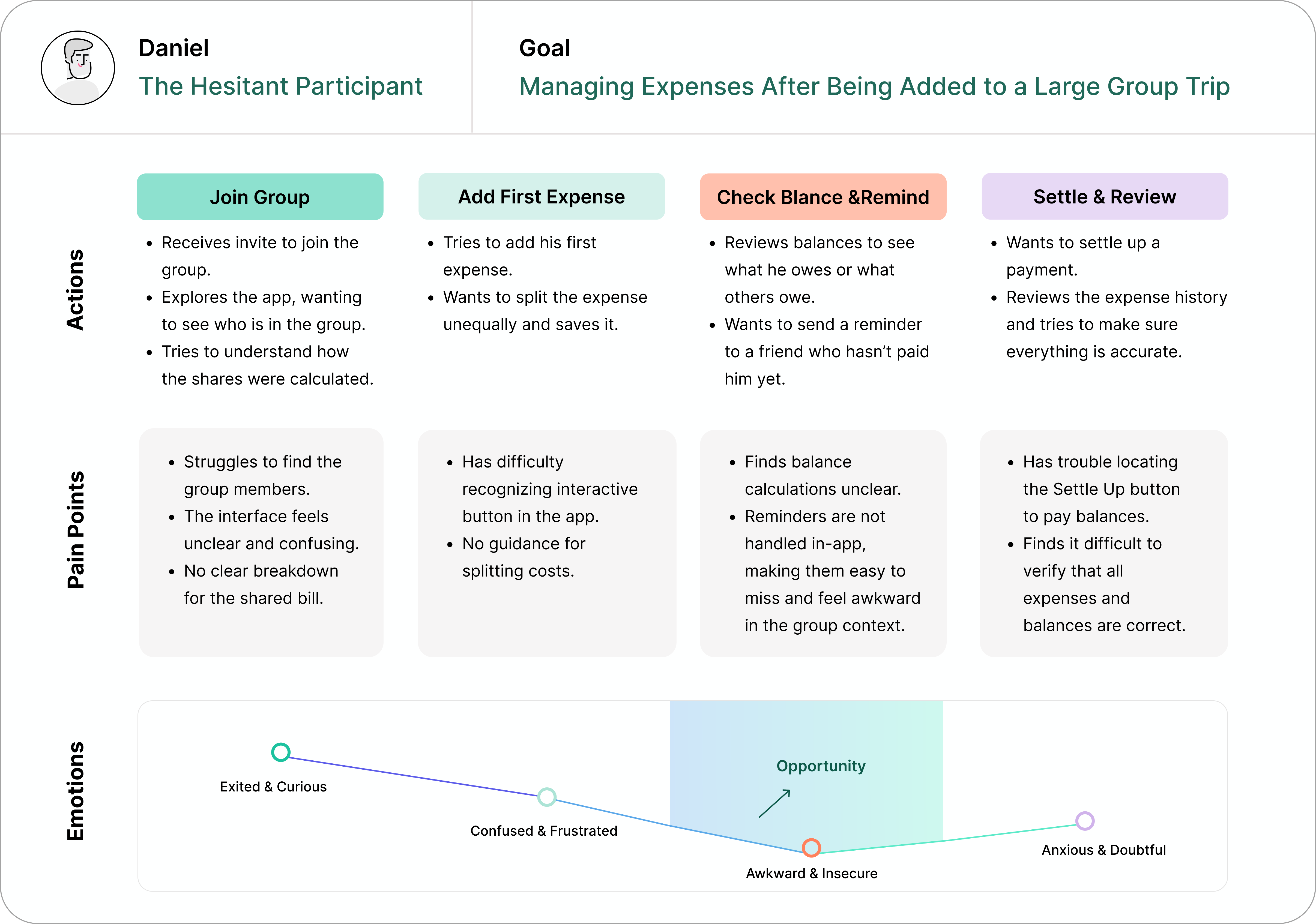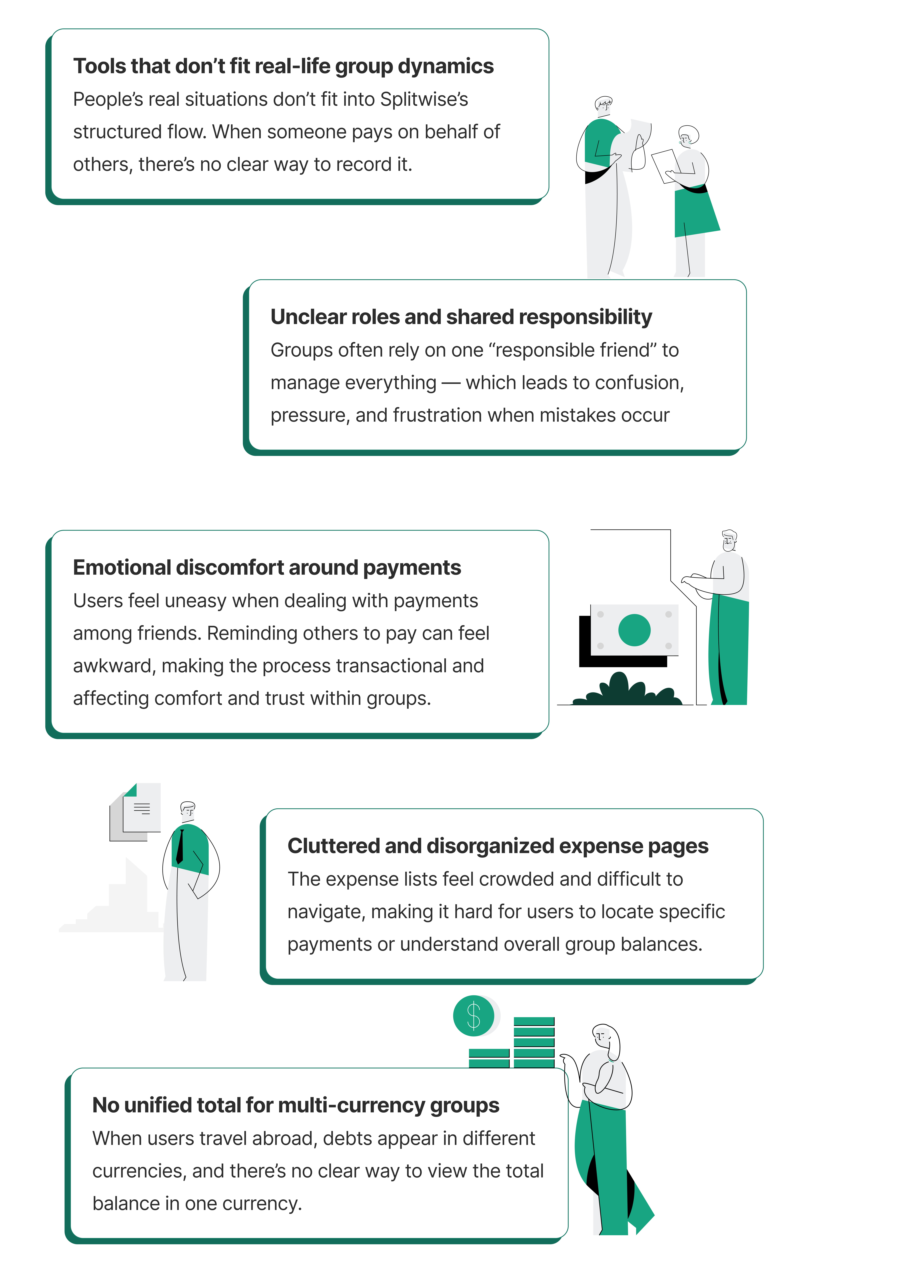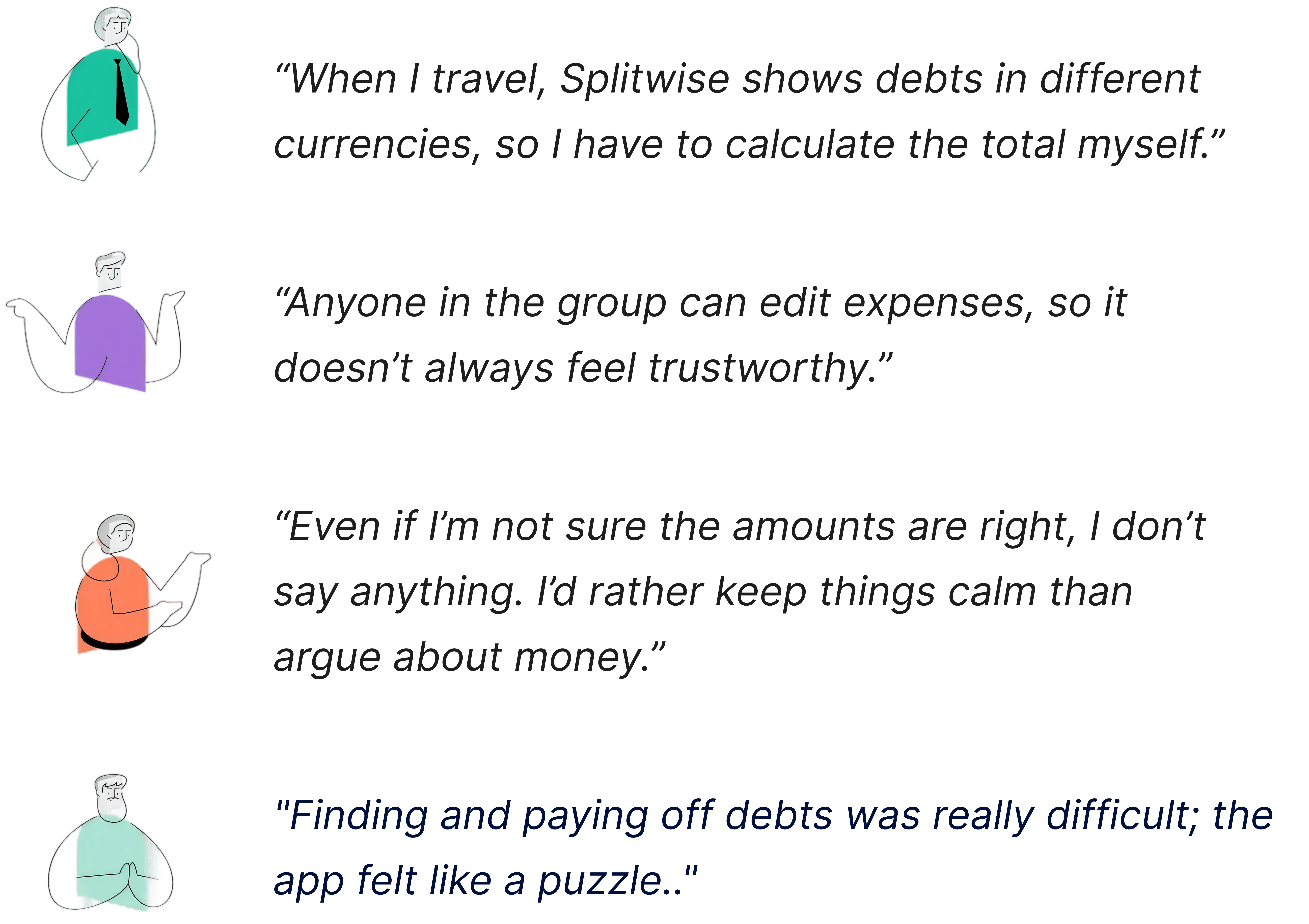 These conversations uncovered recurring pain points: confusion around currencies, uncertainty about editable expenses, and hesitation to speak up about mistakes for fear of tension within the group.