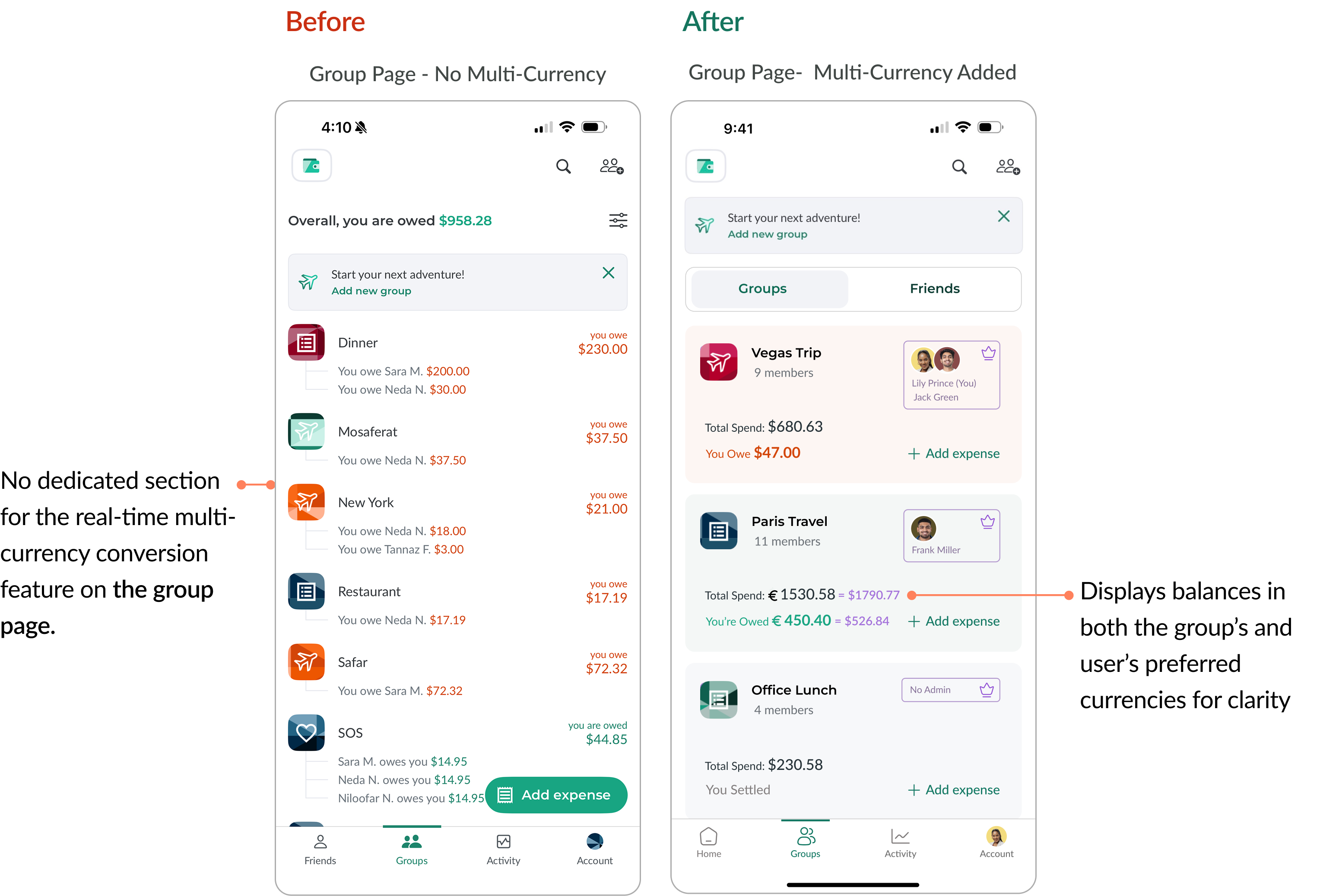 With real-time currency sync, expense breakdown pop-ups, and duplicate detection, the redesign made Splitwise clearer, faster, and more reliable.
