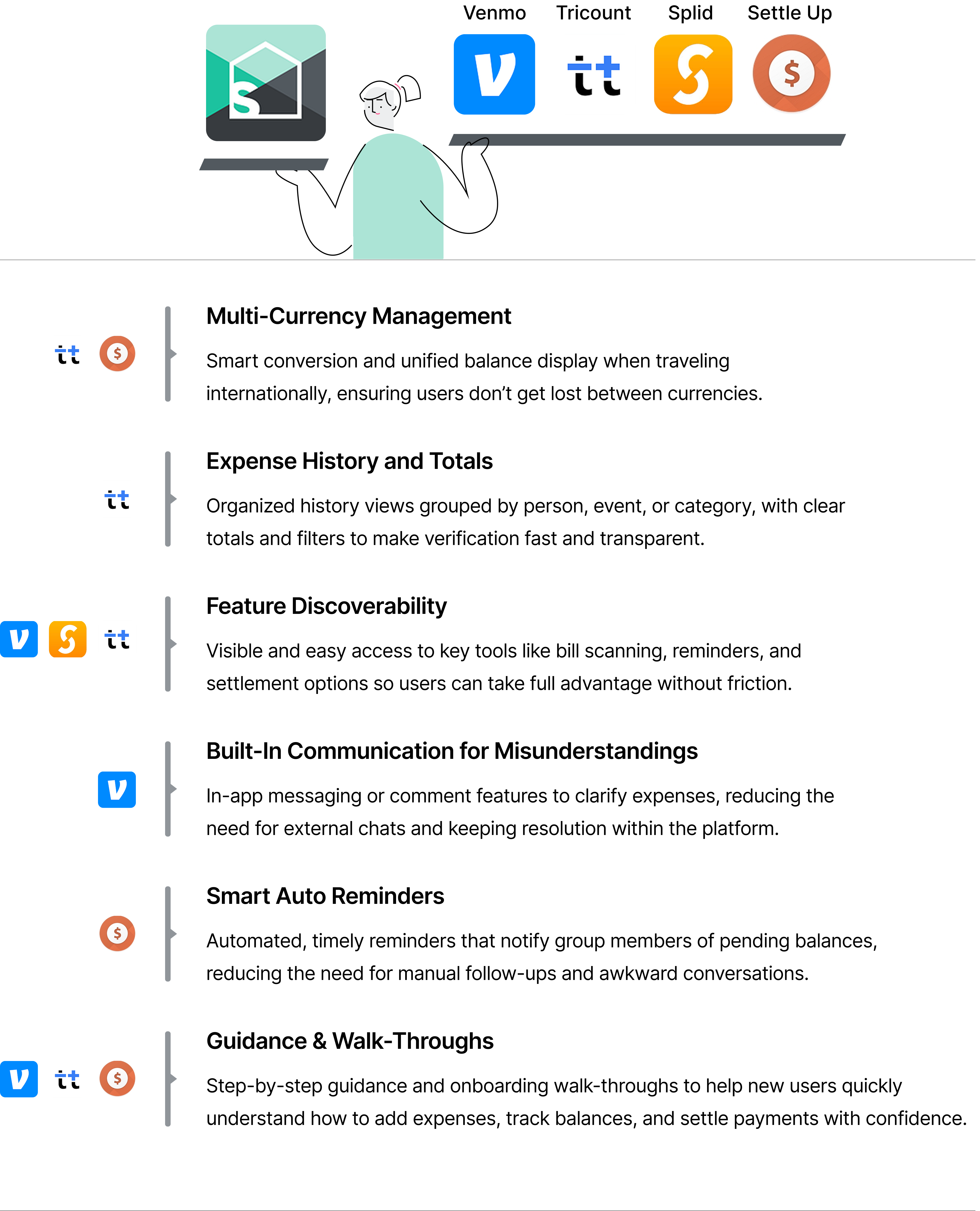 We evaluated Venmo, Tricount, Splid, and Settle Up to understand how they manage group expenses. Our focus was on clarity, trust-building, multi-currency management, and ease of use to identify opportunities for improving Splitwise’s overall experience.