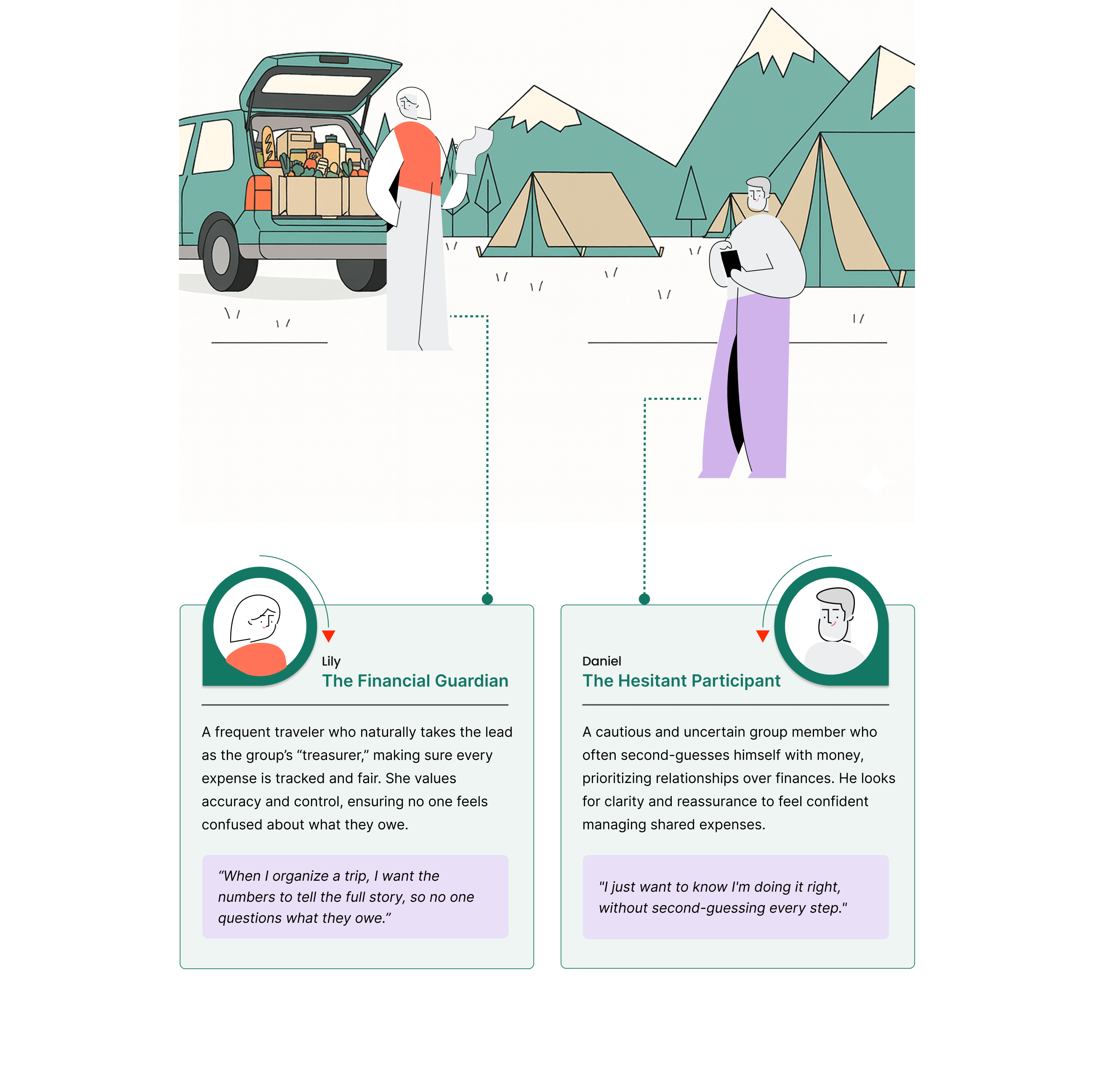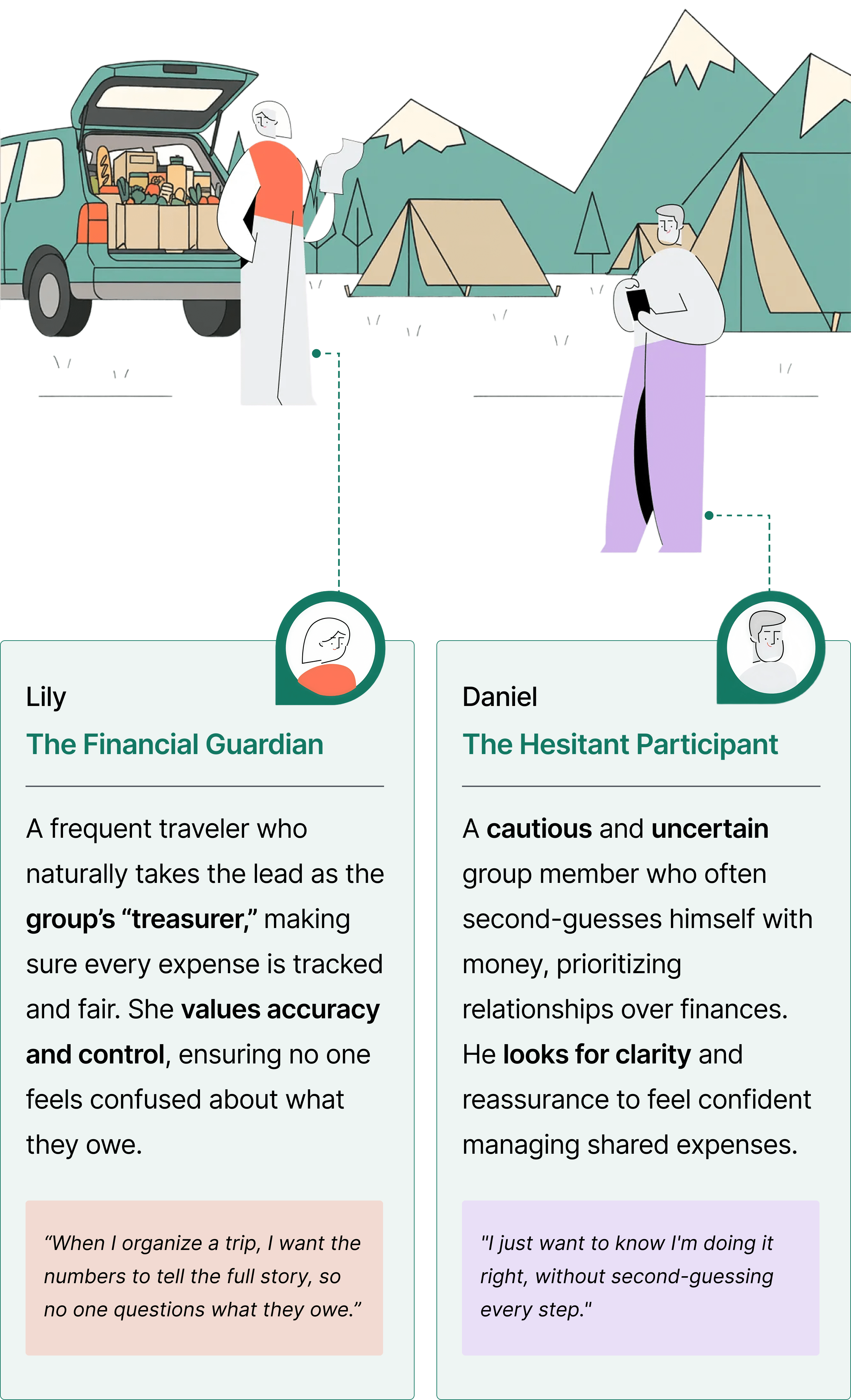 Our research revealed two key personas: Lily, the “Financial Guardian,” who values accuracy and fairness, and Daniel, the “Hesitant Participant,” who seeks clarity and reassurance.
