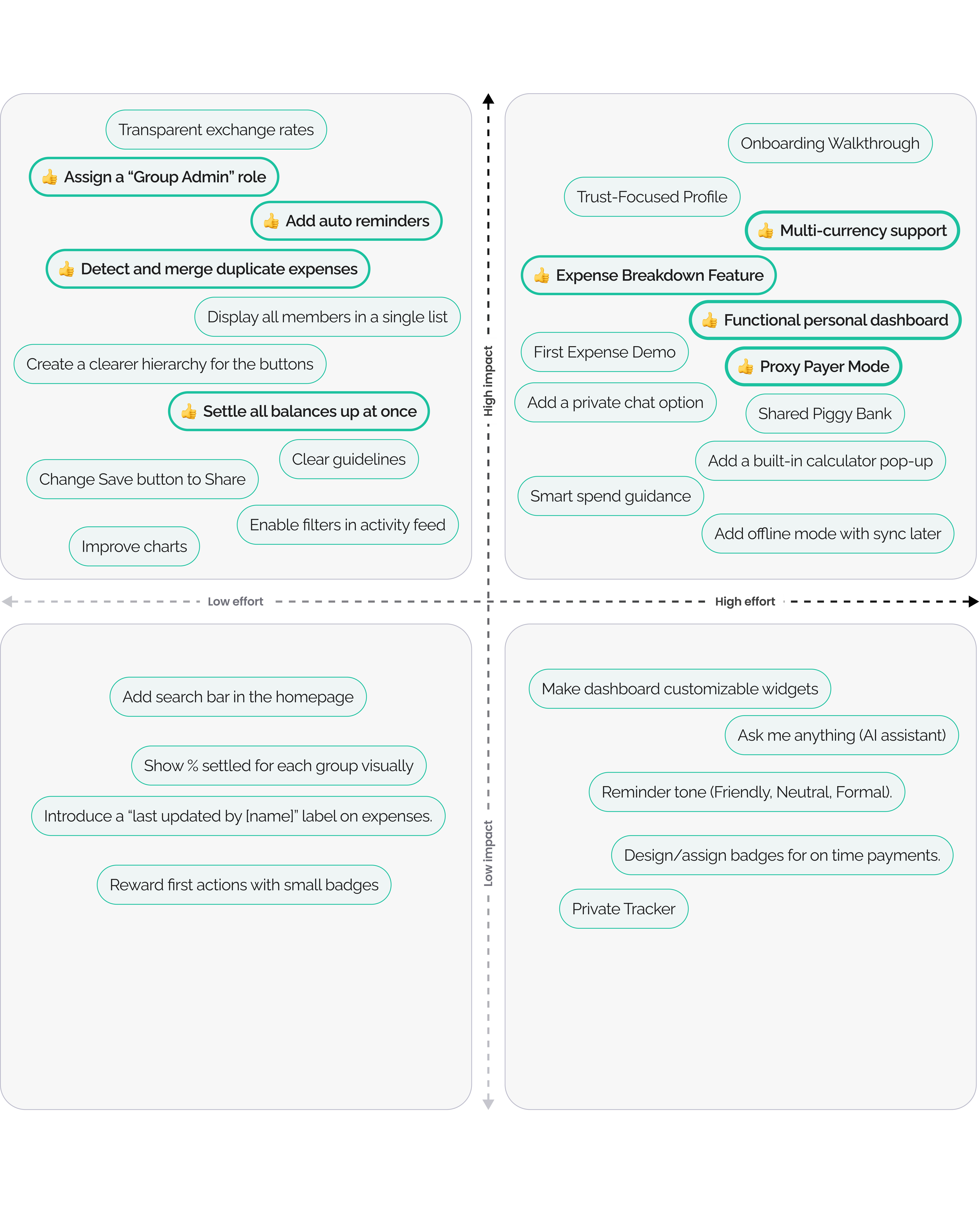 We used an Effort–Impact Matrix to evaluate and prioritize ideas that balanced value and feasibility. This process helped us identify key opportunities such as multi-currency support, an expense breakdown view, a proxy payer mode, auto-reminders, duplicate expense detection, and a group admin role.